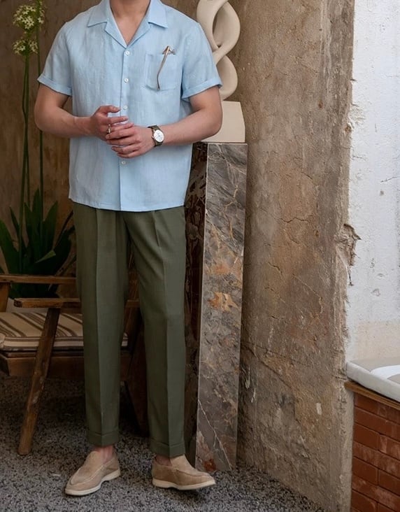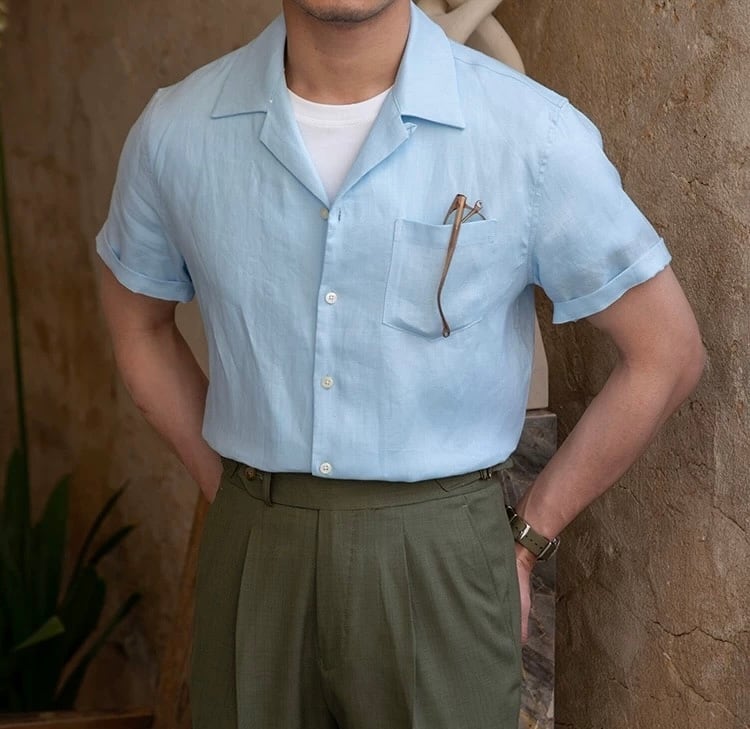 涼しげでおしゃれなこのリネンシャツは、軽やかな素材感が特徴です。オープンカラーのデザインがリラックスした雰囲気を演出し、夏のお出かけやビーチへのお誘いにもぴったりです。