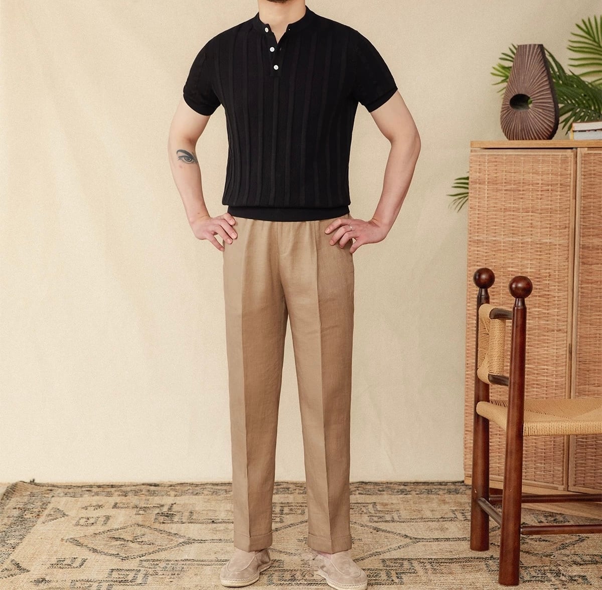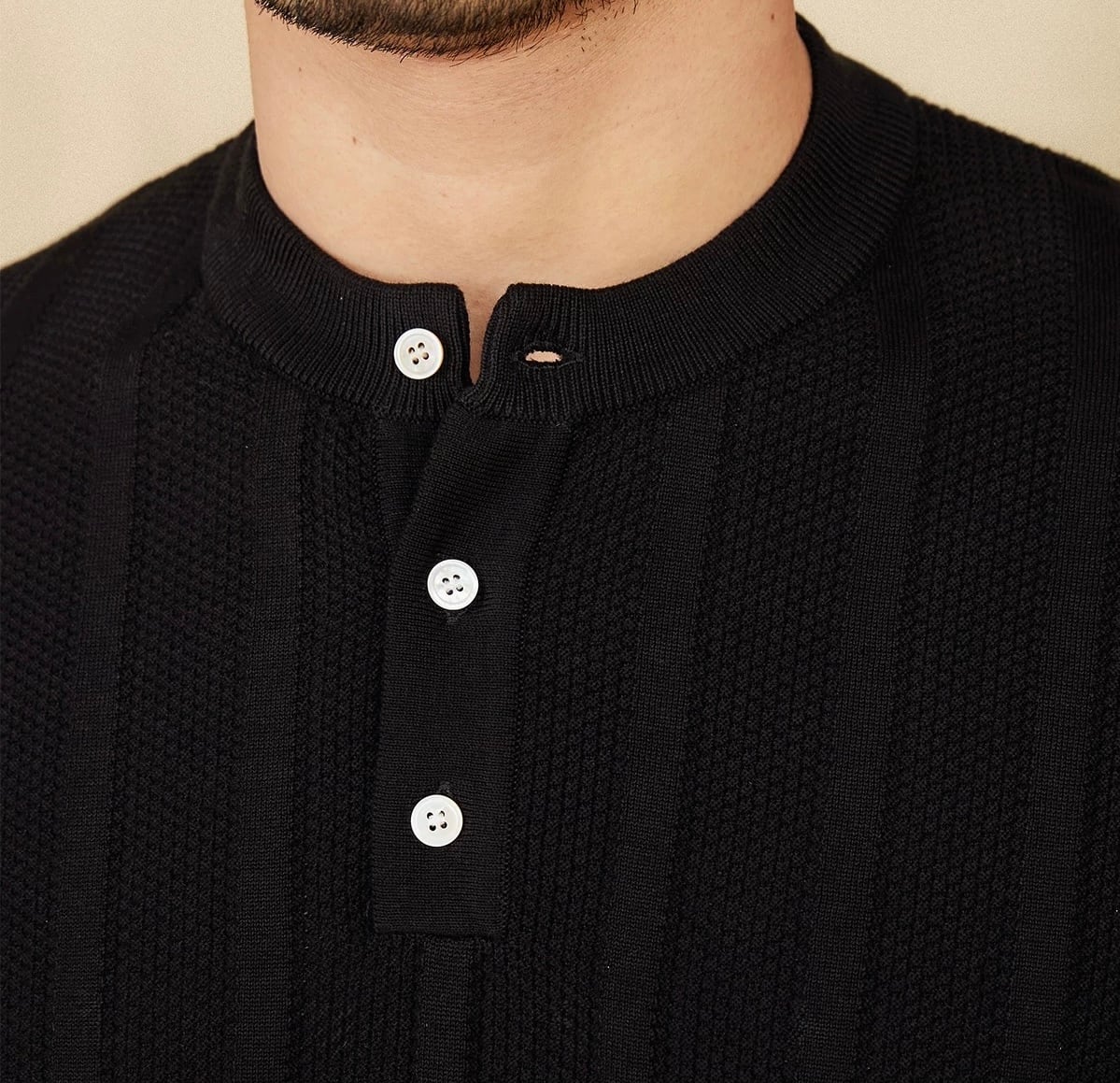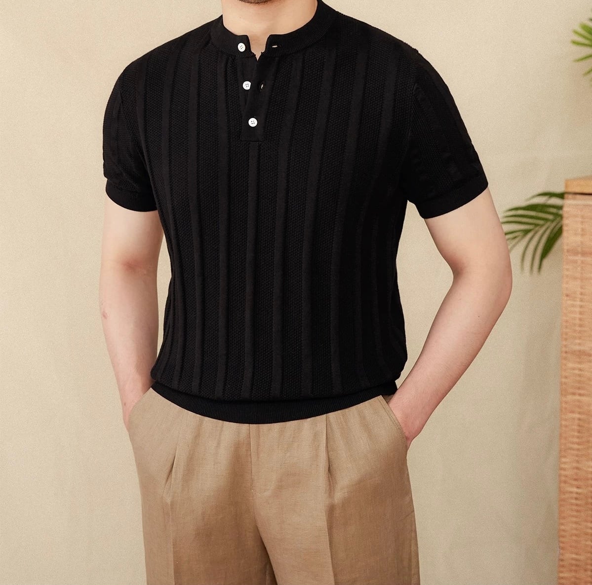リブ網のヘンリーネックデザインが特徴のこのニットTシャツは、やわらかくしなやかな素材感が魅力です。