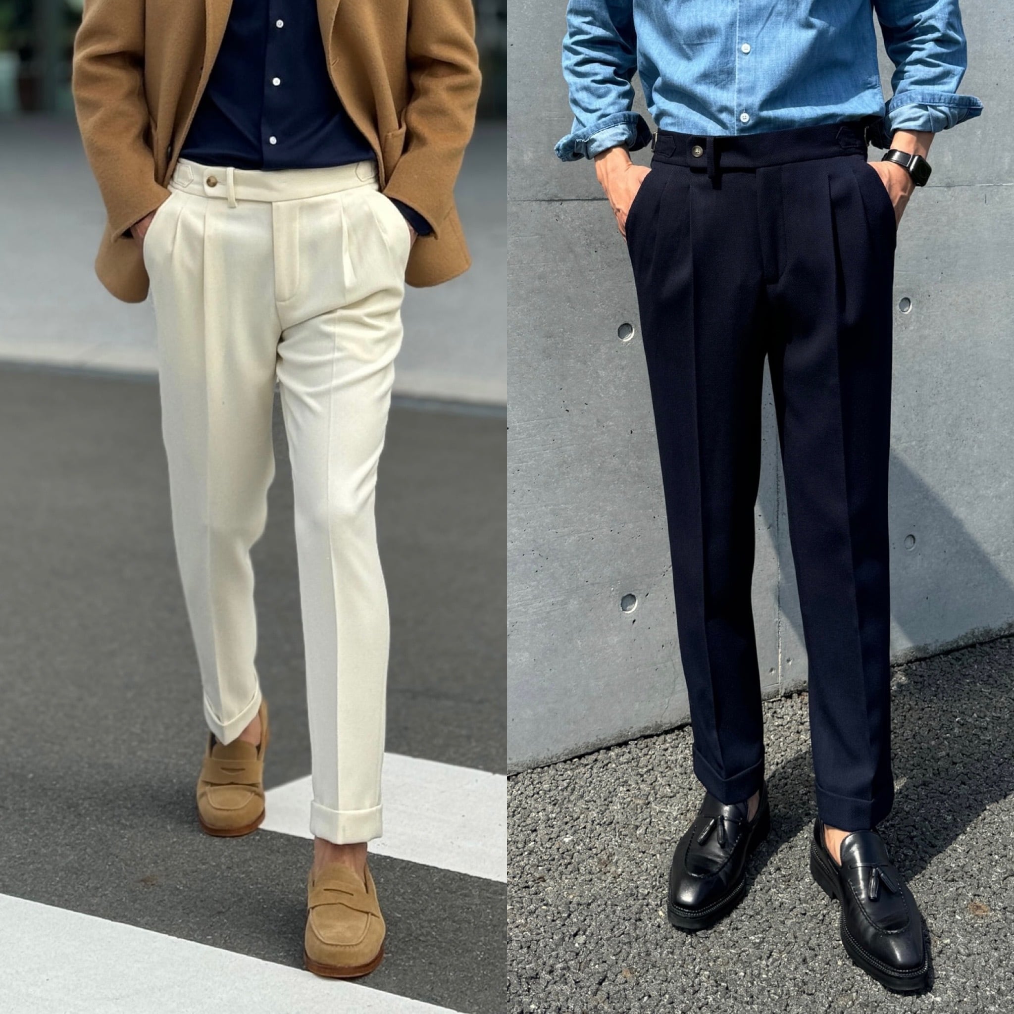 このスラックスは、ビジネスシーンからカジュアルまで幅広いシーンで活躍します。