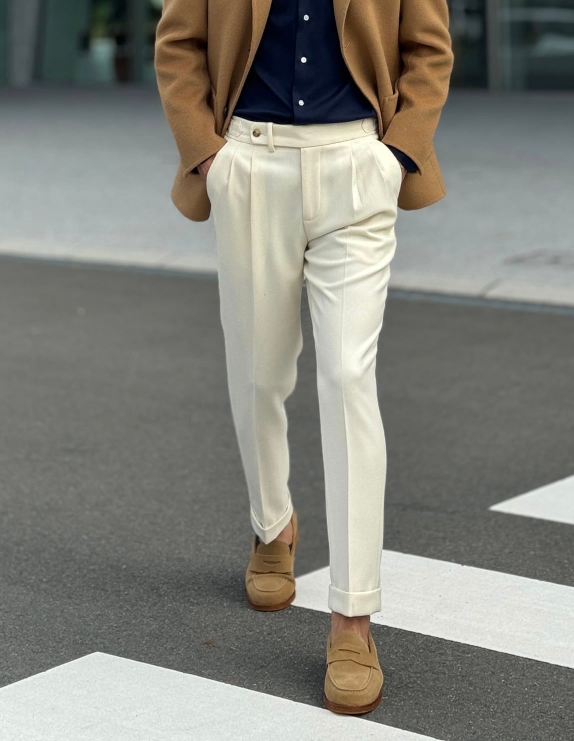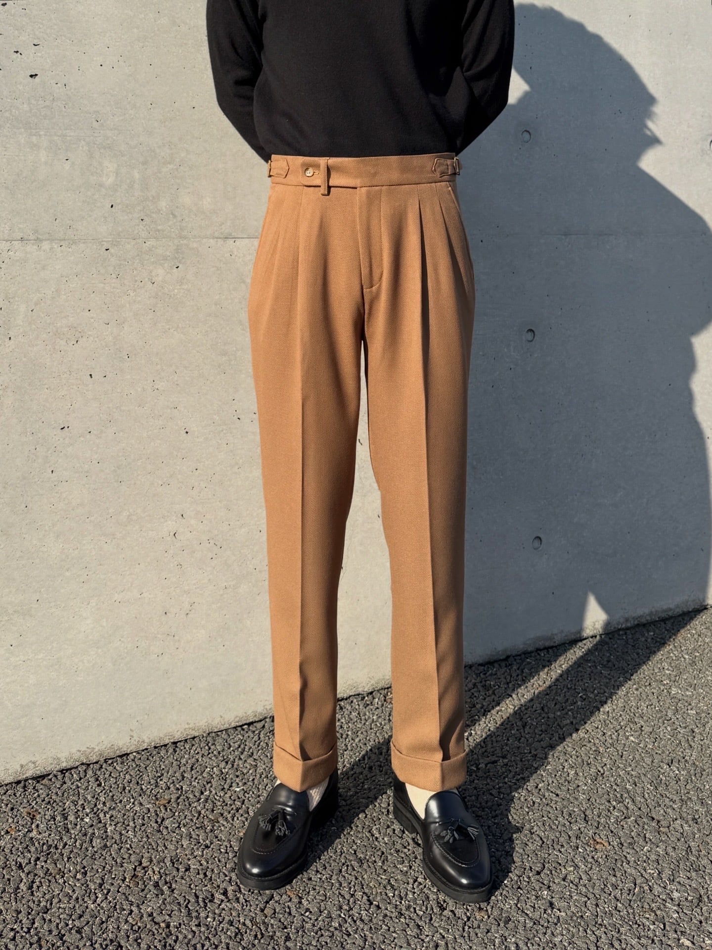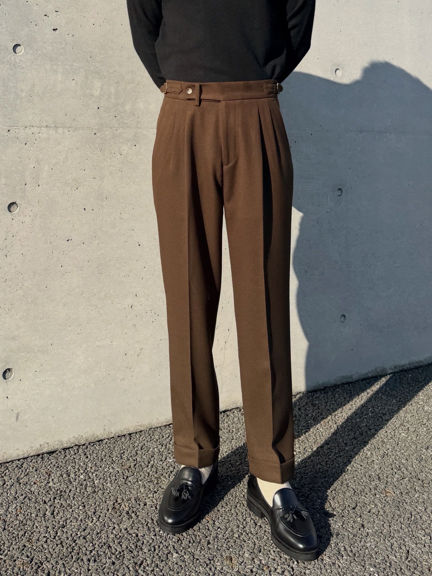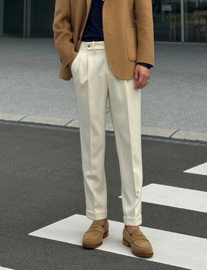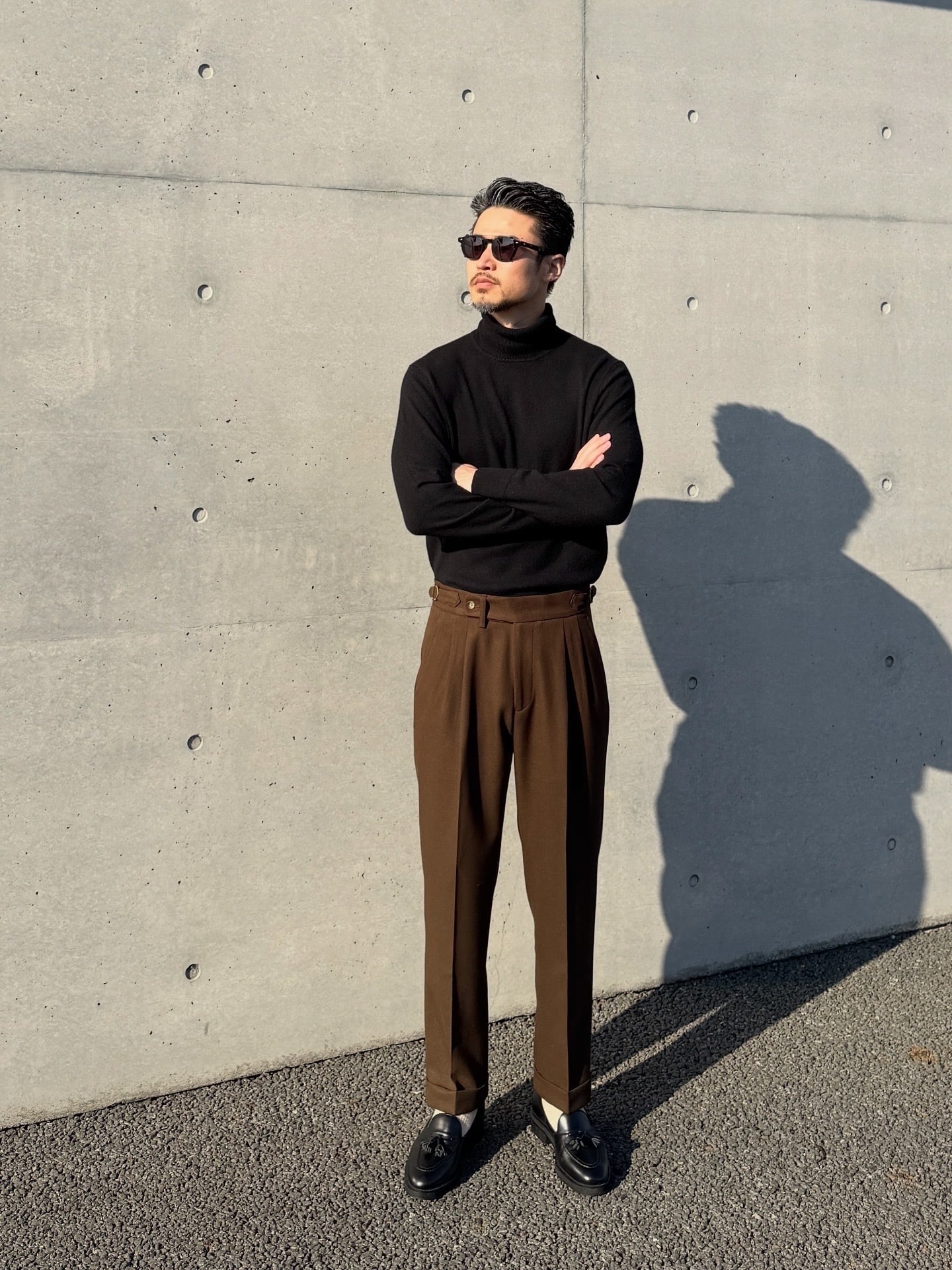 ツータック入りで足首まで続くシルエットが美しく、膝周りもゆったりとした履き心地が特徴です。