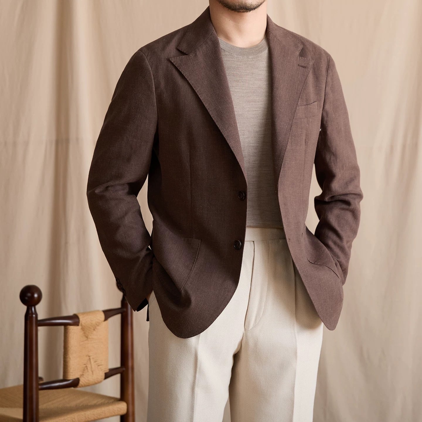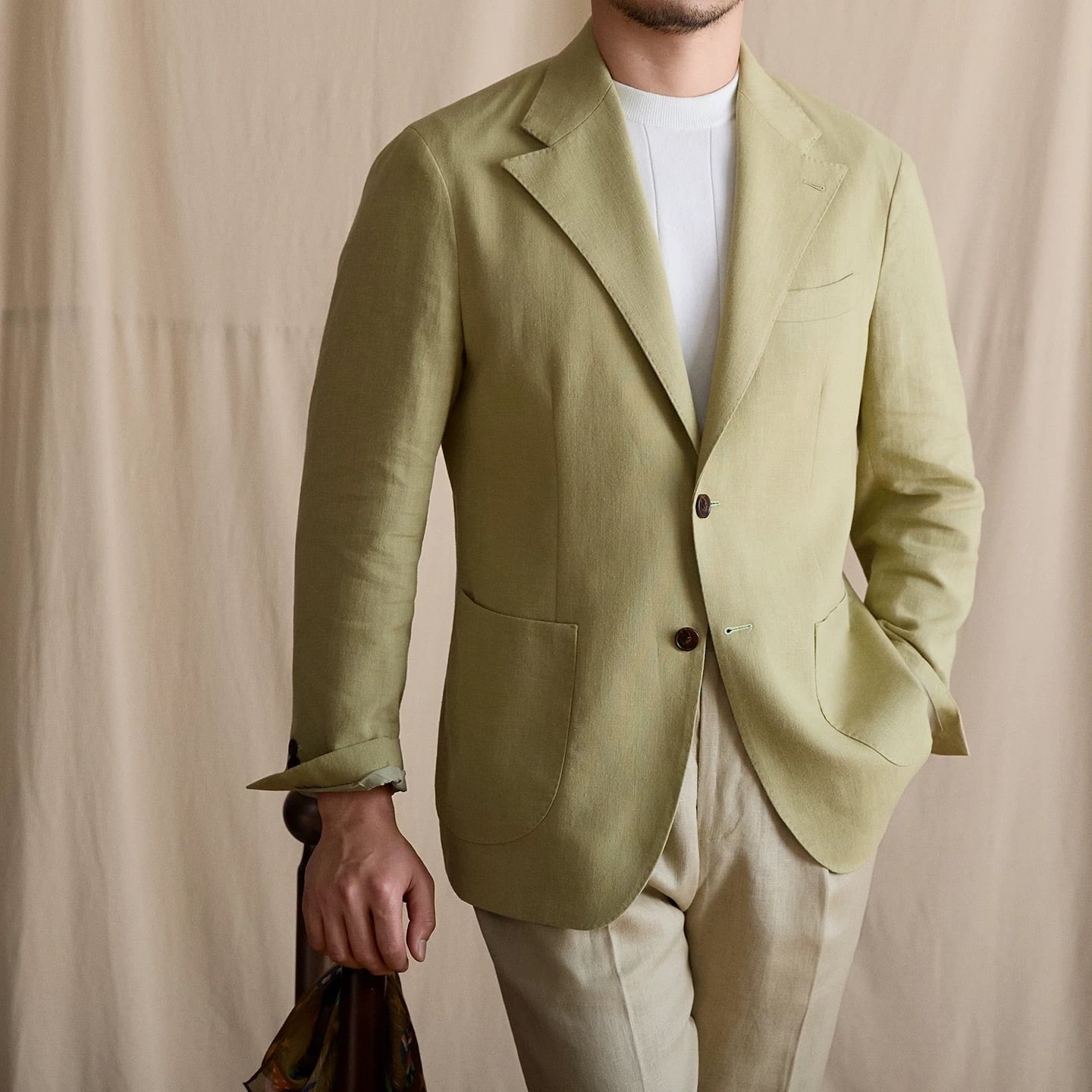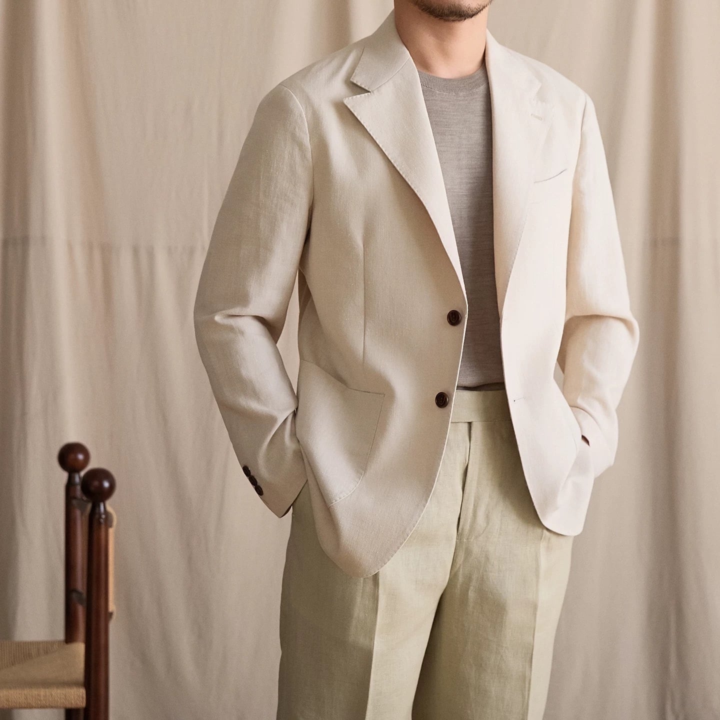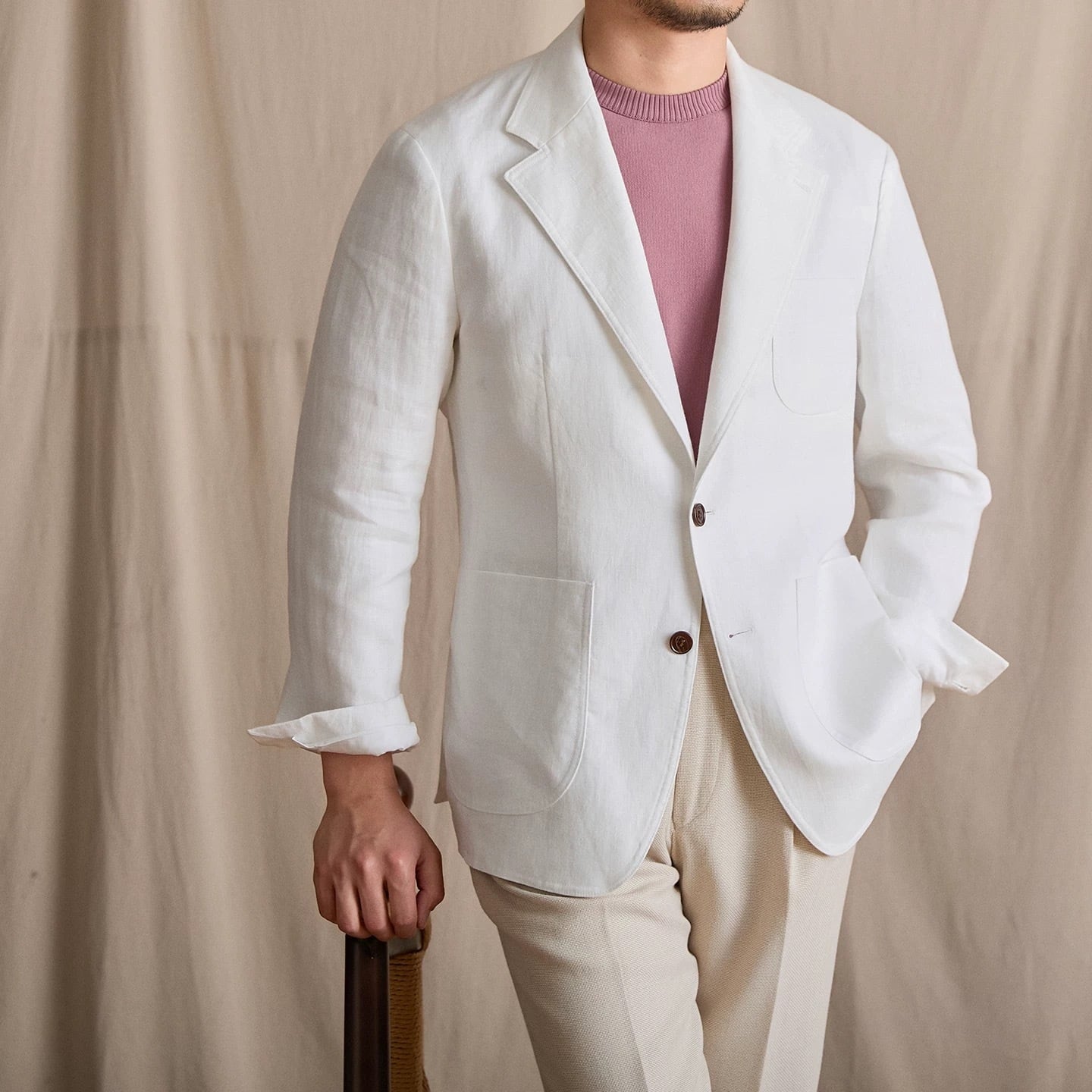 リネンアンコンジャケットは、シンプルながらもスタイリッシュなシルエットで、着用することで自信を持った印象を与えます。多様なコーディネートに合わせやすいアイテムで、季節感のあるオシャレを楽しんでいただけます!