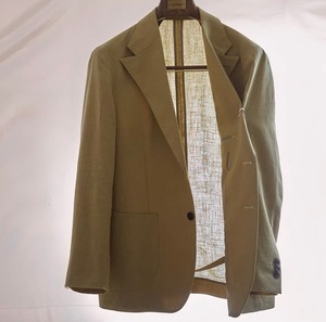このジャケットは、リネン混素材を使用しており、軽やかな着心地と通気性が魅力です。アンコン仕立てのデザインが特徴で、カジュアルやスマートなシーンでも幅広く活躍します。