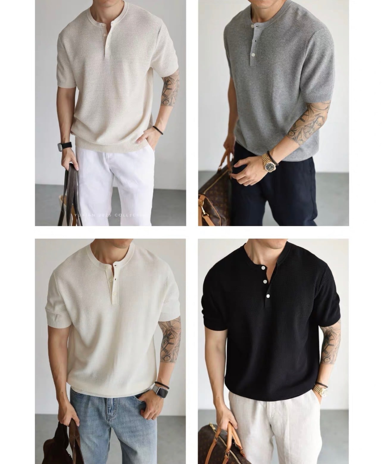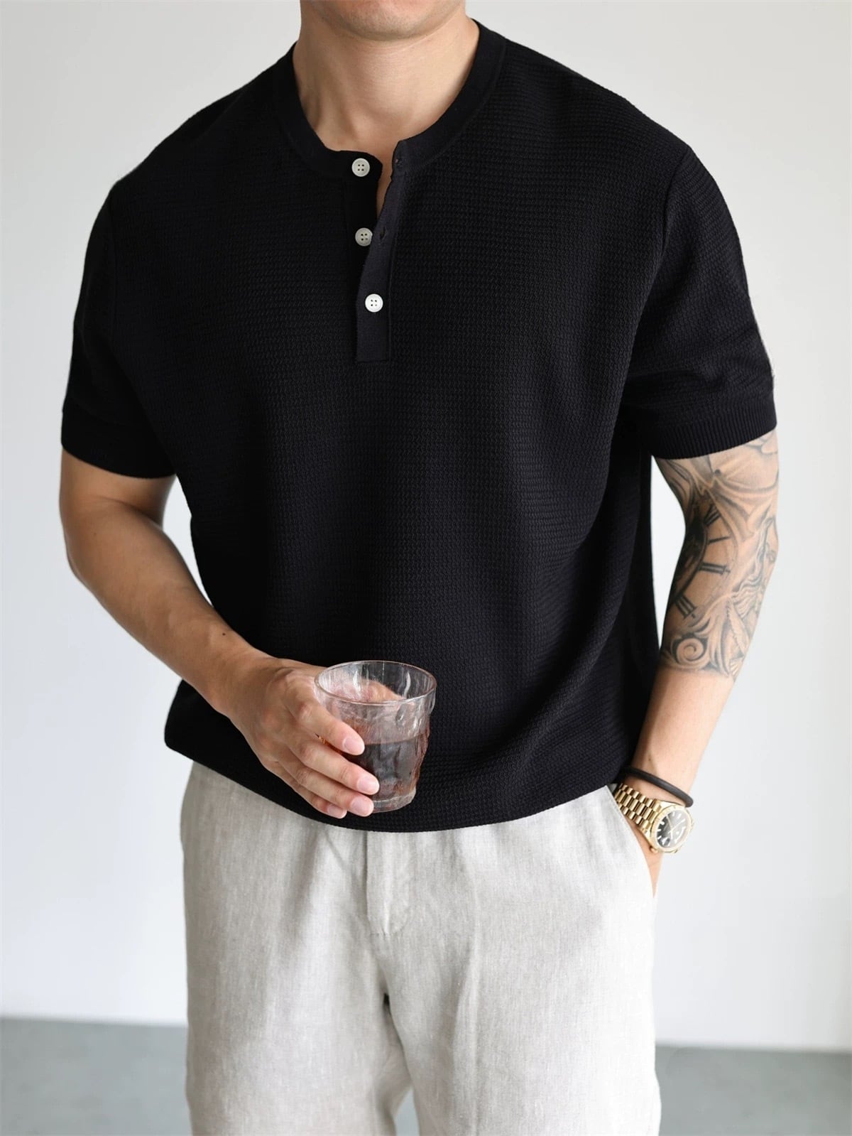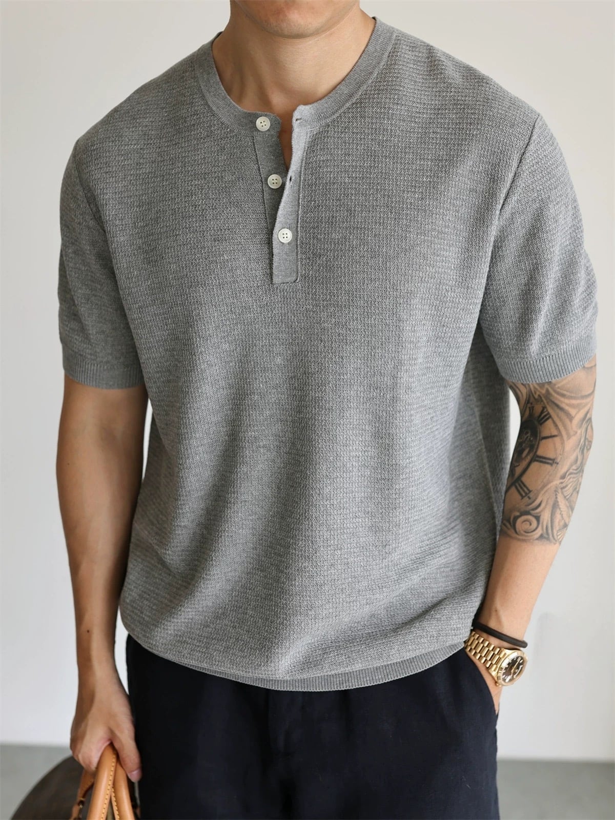 このTシャツは、少し肉厚なニット素材を使用しており、一枚でサマになる魅力を持っています。ヘンリーネックデザインは着こなしを引き立て、カジュアルからスマートカジュアルまで幅広いスタイルに対応します。