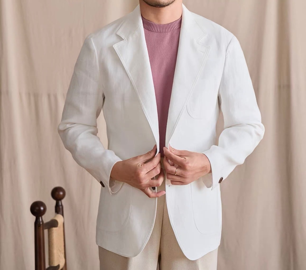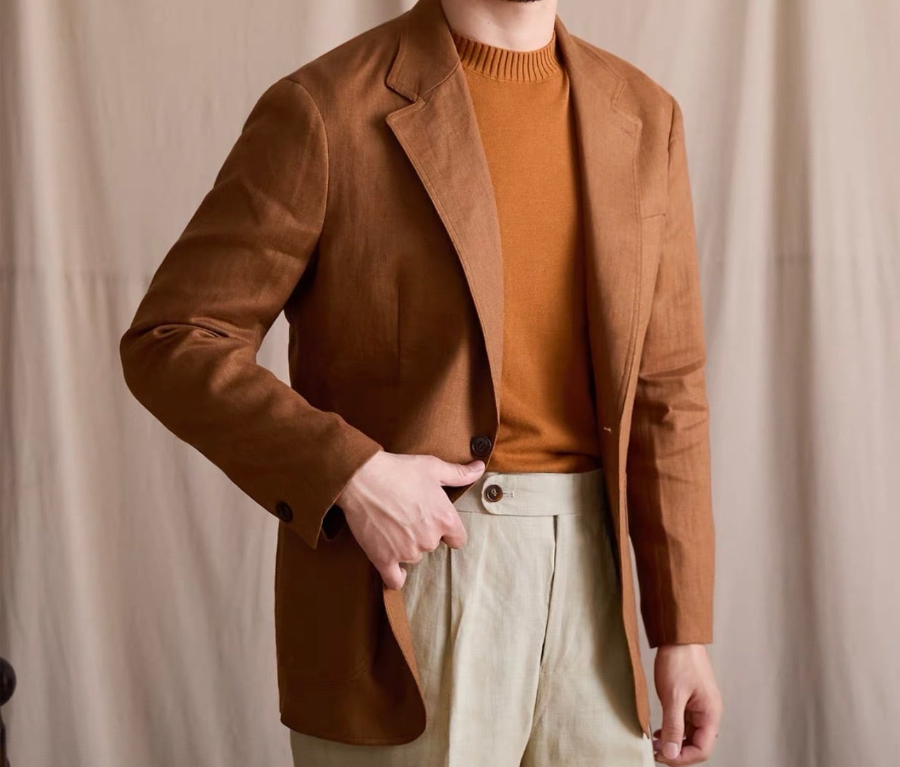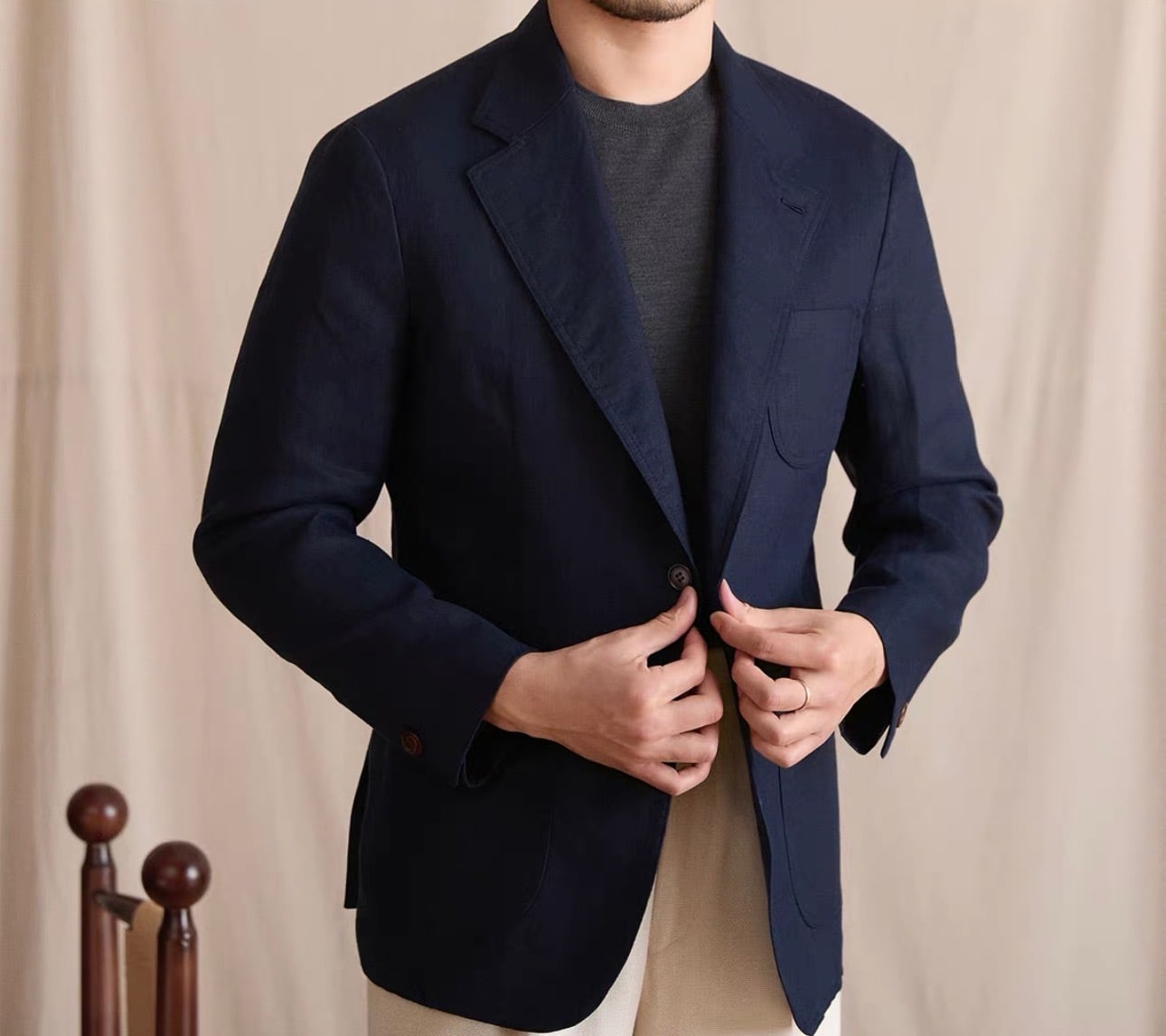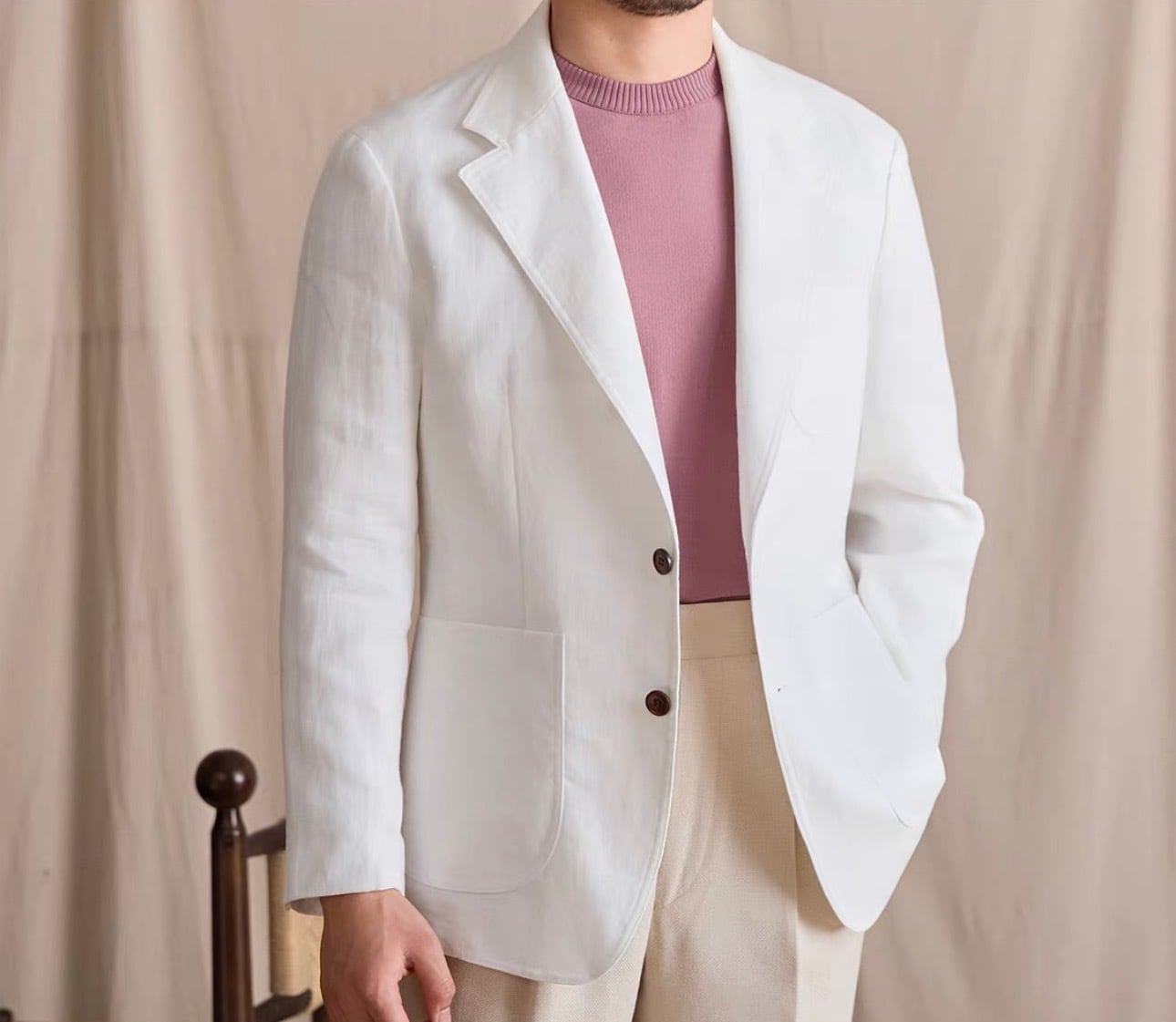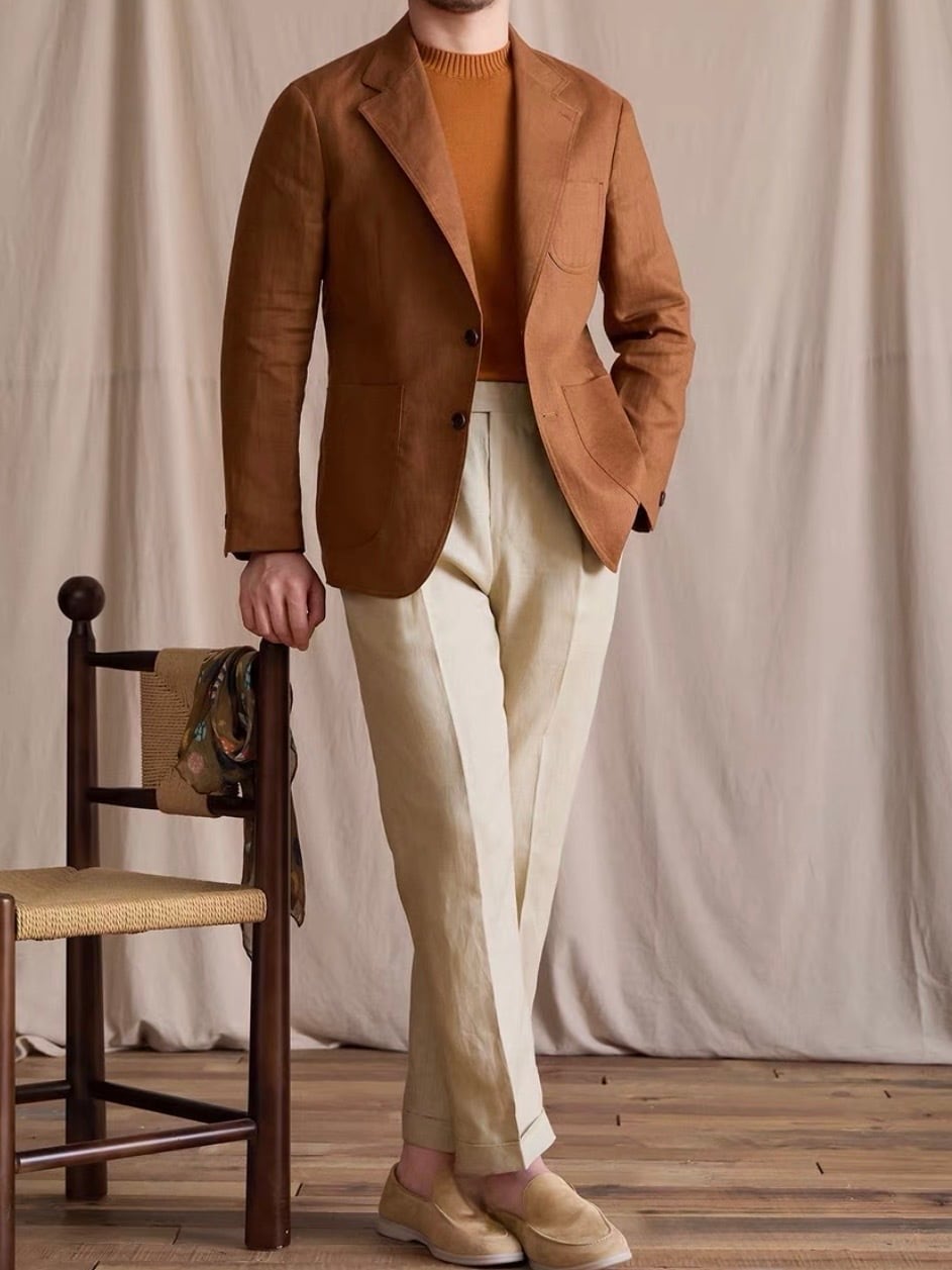 リネンアンコンジャケットは、シンプルでありながらスタイリッシュなシルエットが特徴です。着ることで自信を持った印象を演出し、多様なコーディネートにスムーズに合わせられます。これを羽織ることで、季節感のあるスタイルを思う存分楽しむことができるでしょう!