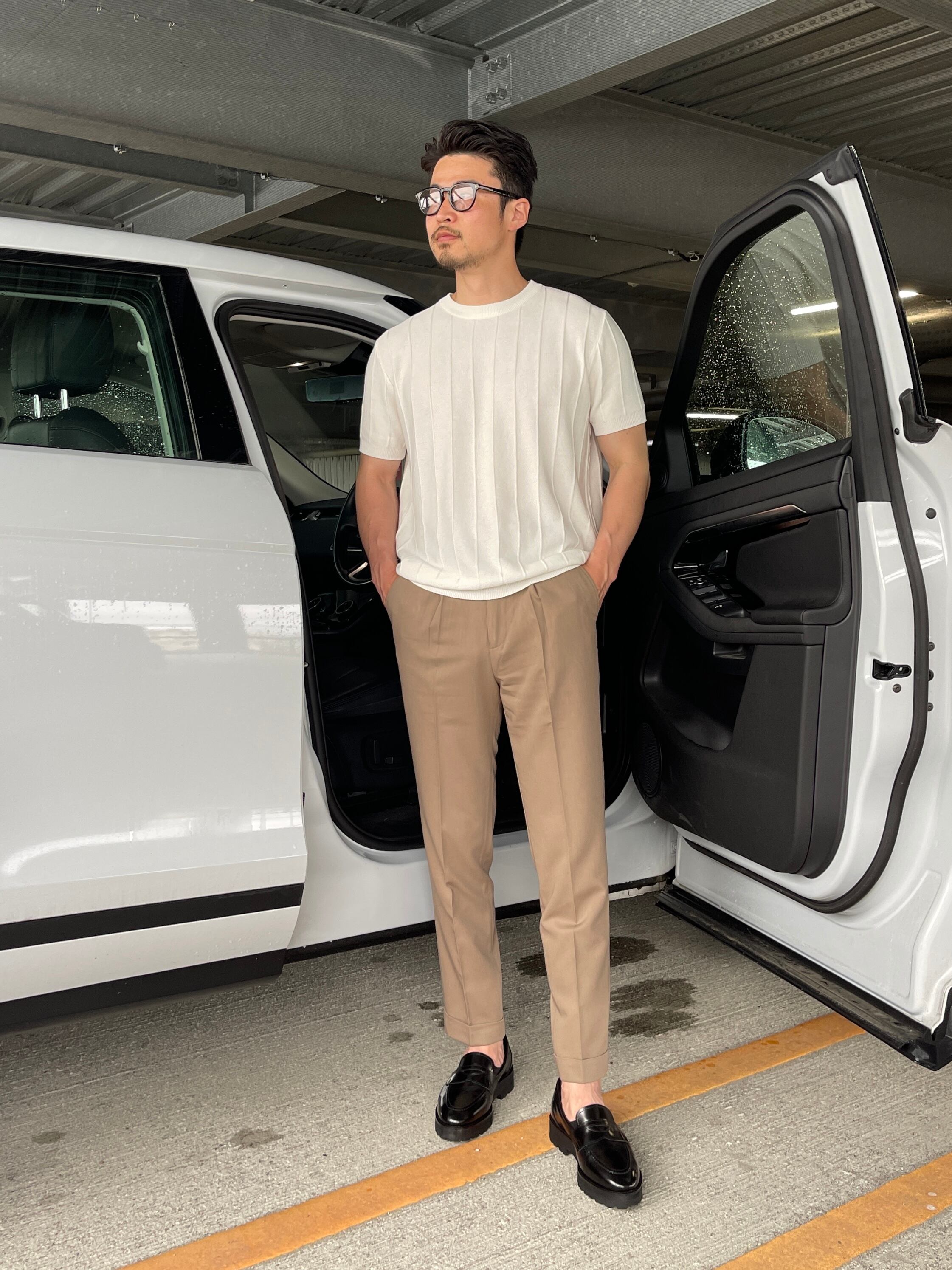 商品名の通り、ニット素材で作られたTシャツです。カジュアルなスタイルはもちろん、ジャケットと合わせたフォーマルなコーディネートにも合わせることができます。