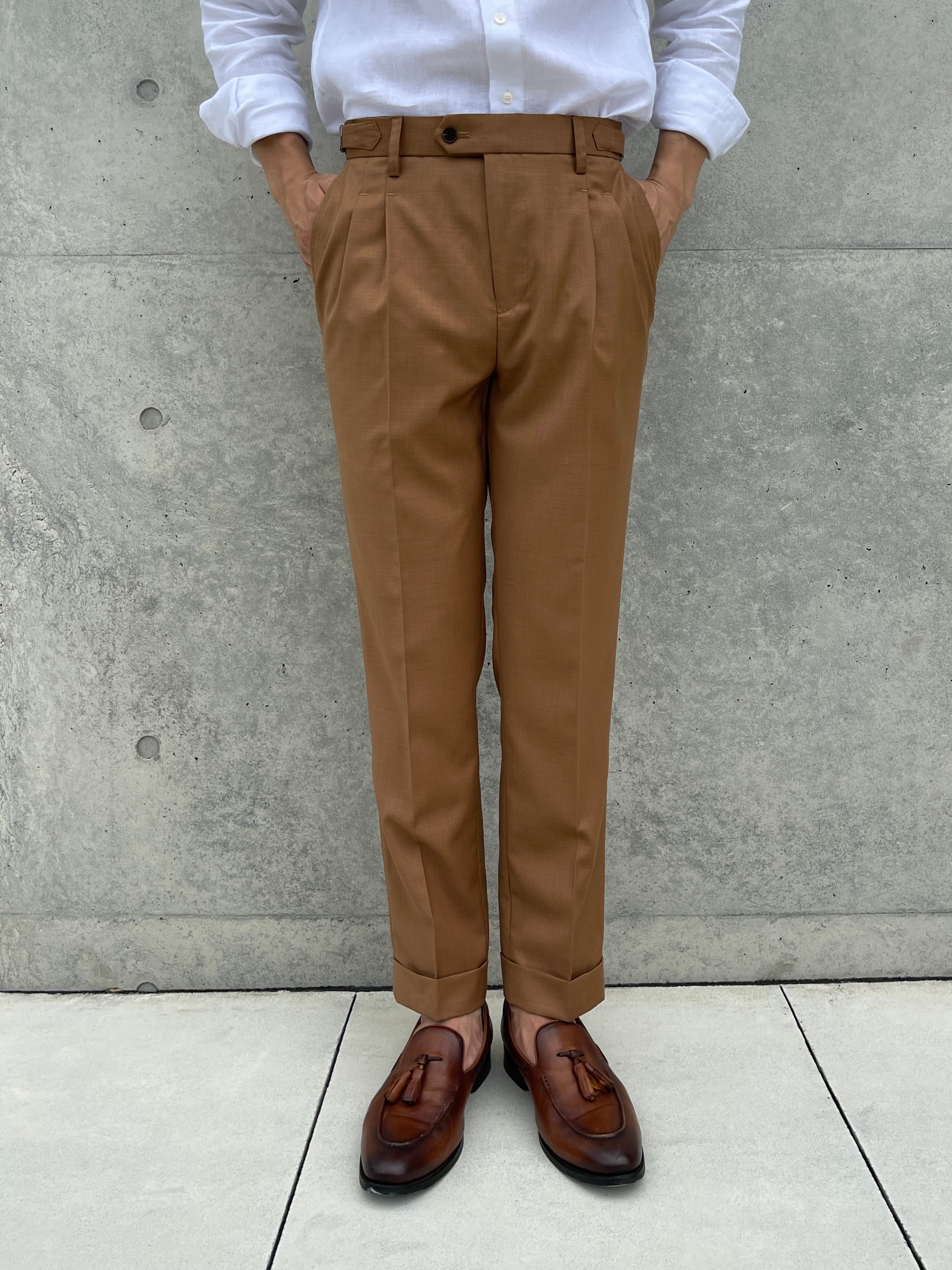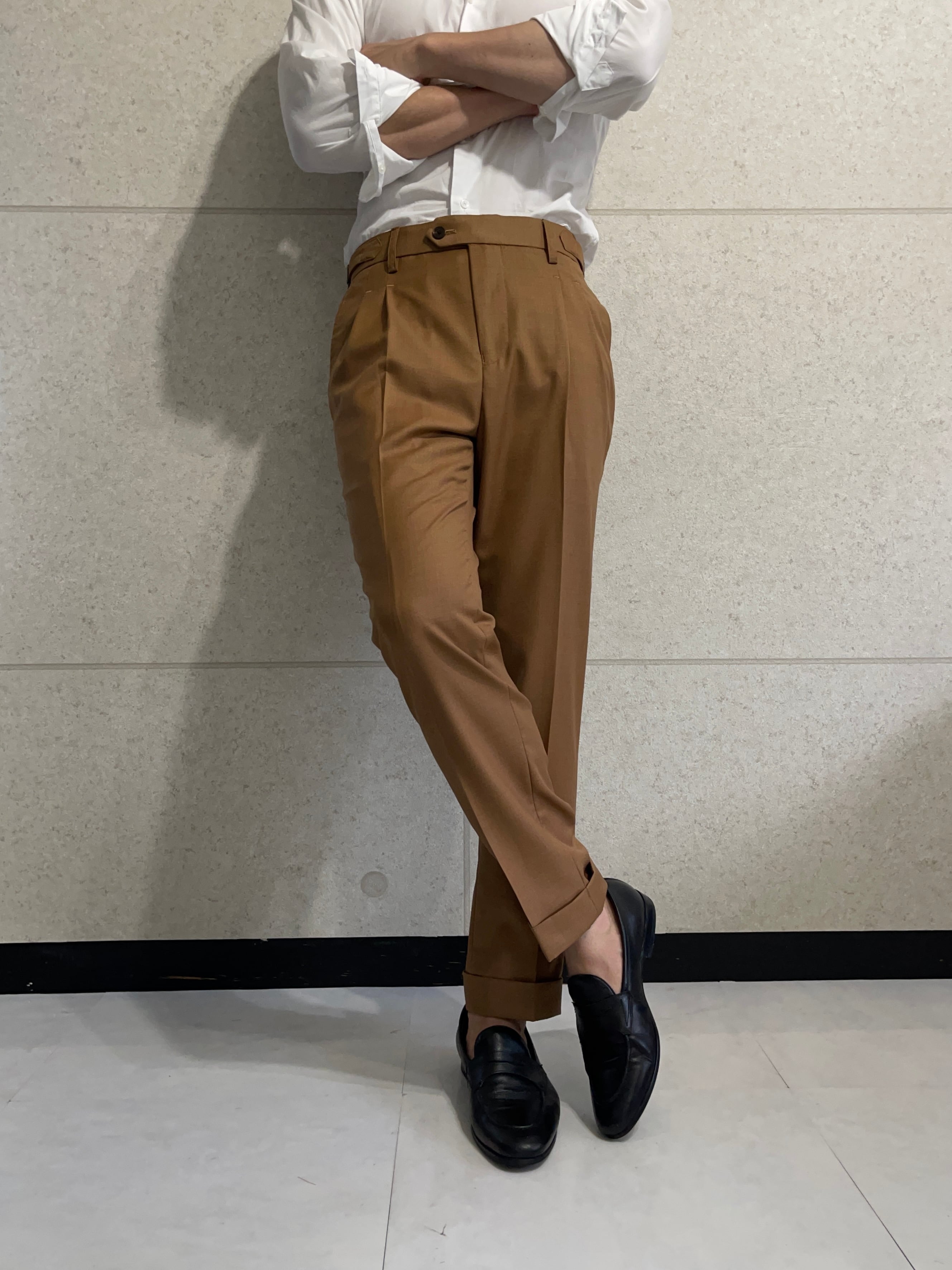 豊かな色味と風合いで、魅了するウールスラックス。優れた素材とデザインで、あなたのスタイルを引き立てます。日常のコーディネートや特別な場面にもおすすめの逸品です。是非、お手元でその高い品質をご体感ください。