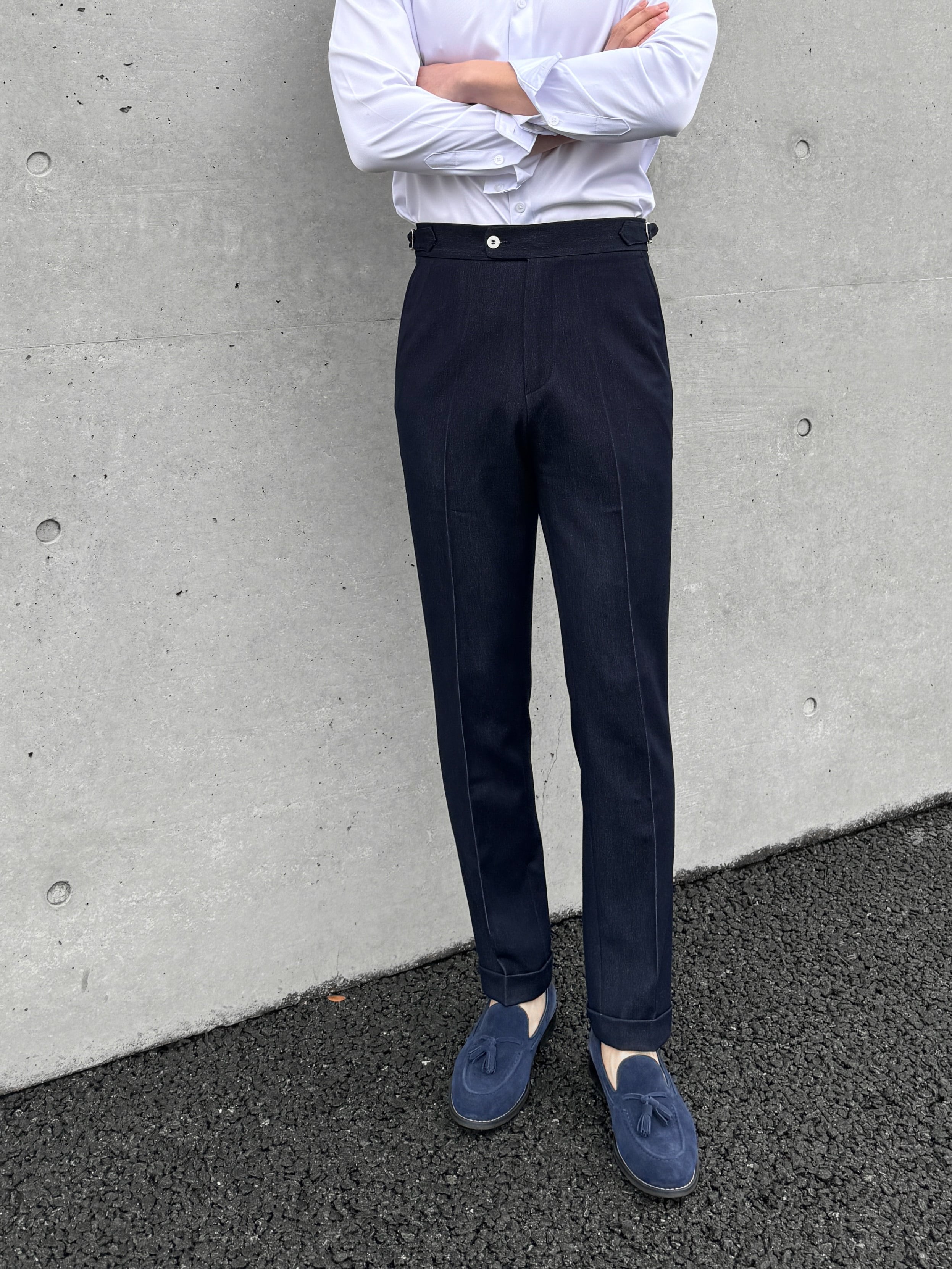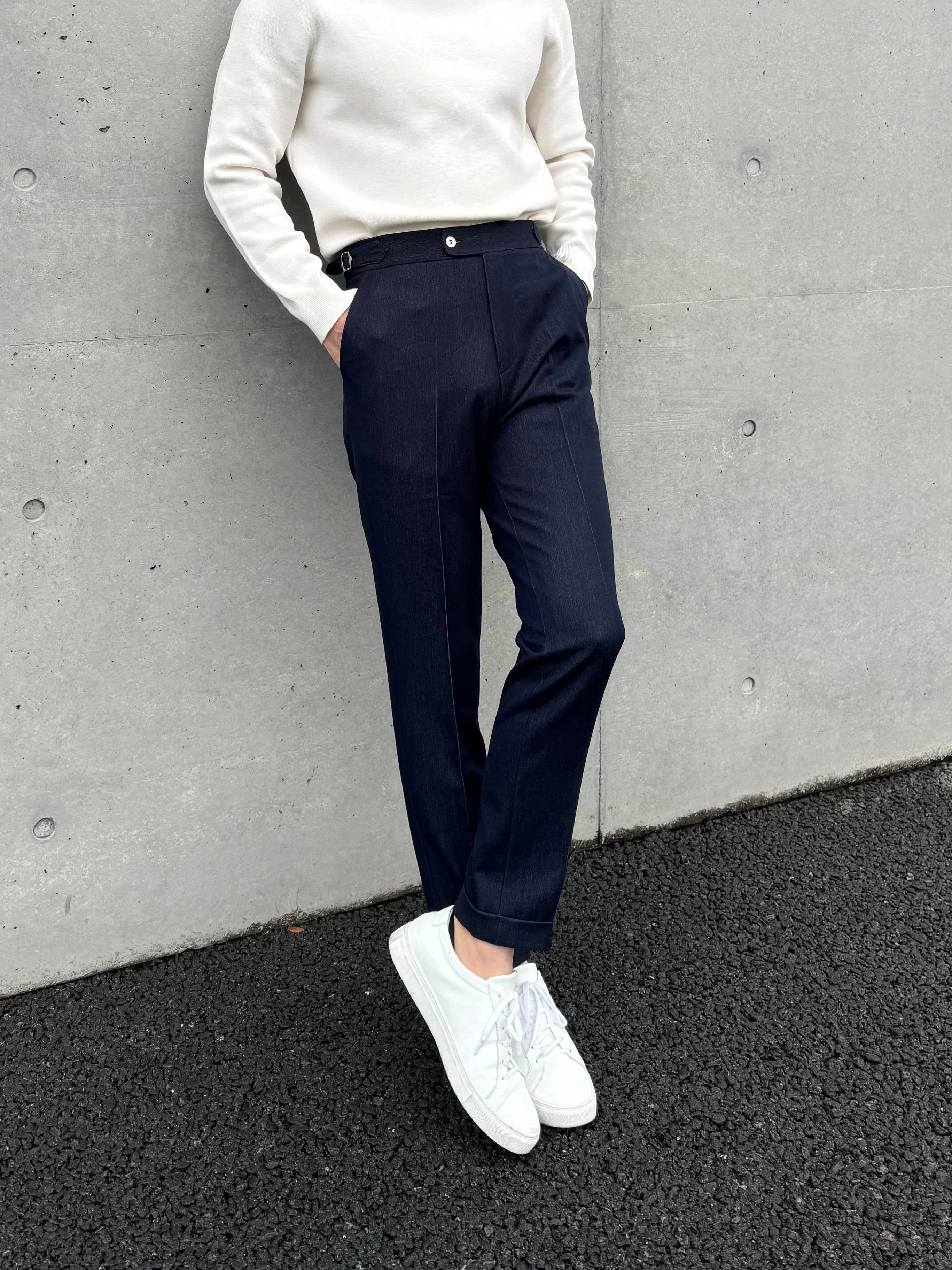 ※デニムライクベルトレススラックスは、デニムのような風合いとカジュアルさを持ちながらも、きれい目で上品な印象を与えるアイテムです。ベルトレスデザインで腰回りがスッキリし、ラフなスタイルでもスマートなシルエットを演出します。