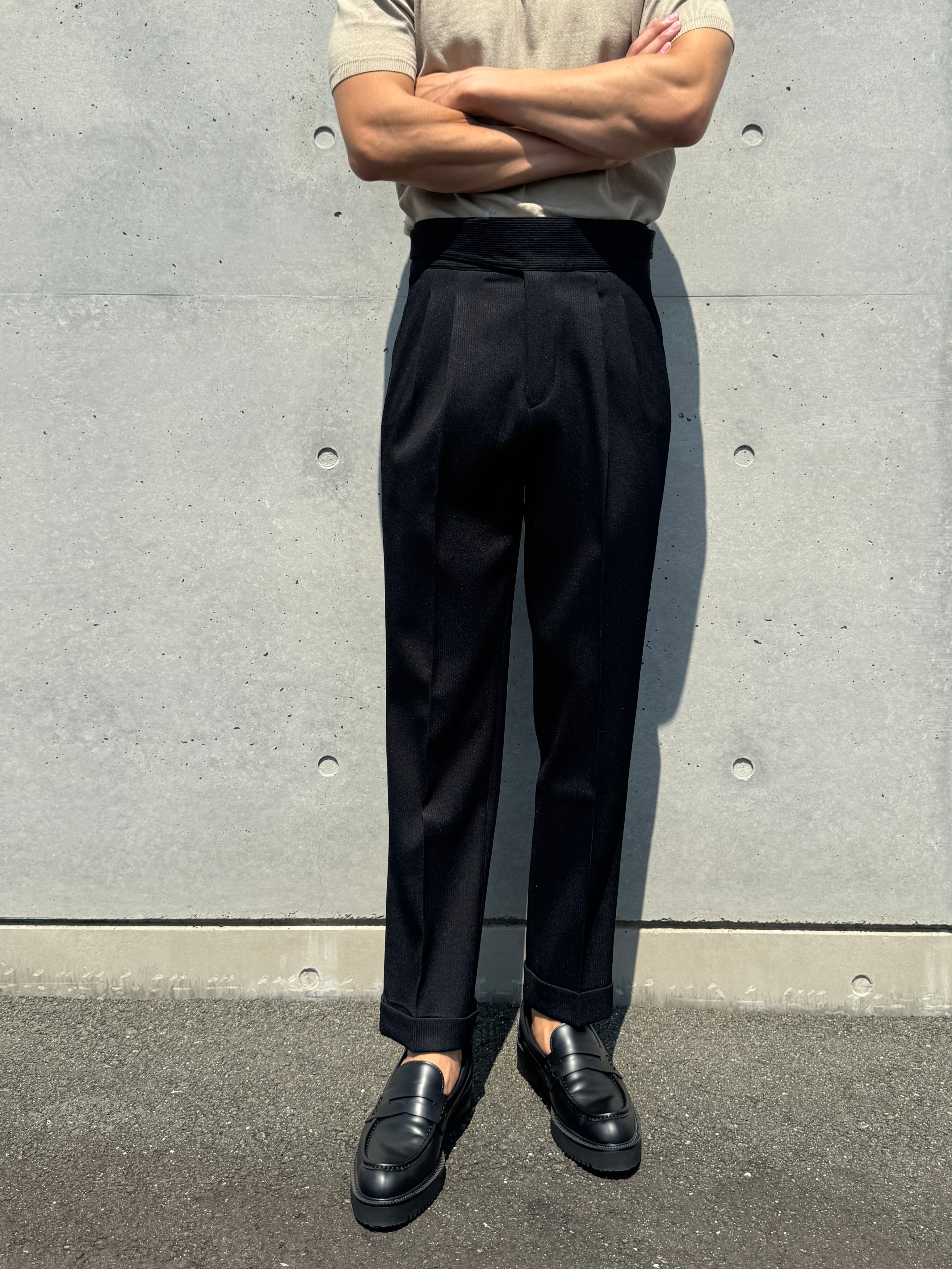 凹凸のある生地感が魅力の秋冬用ハイウエストパンツ。