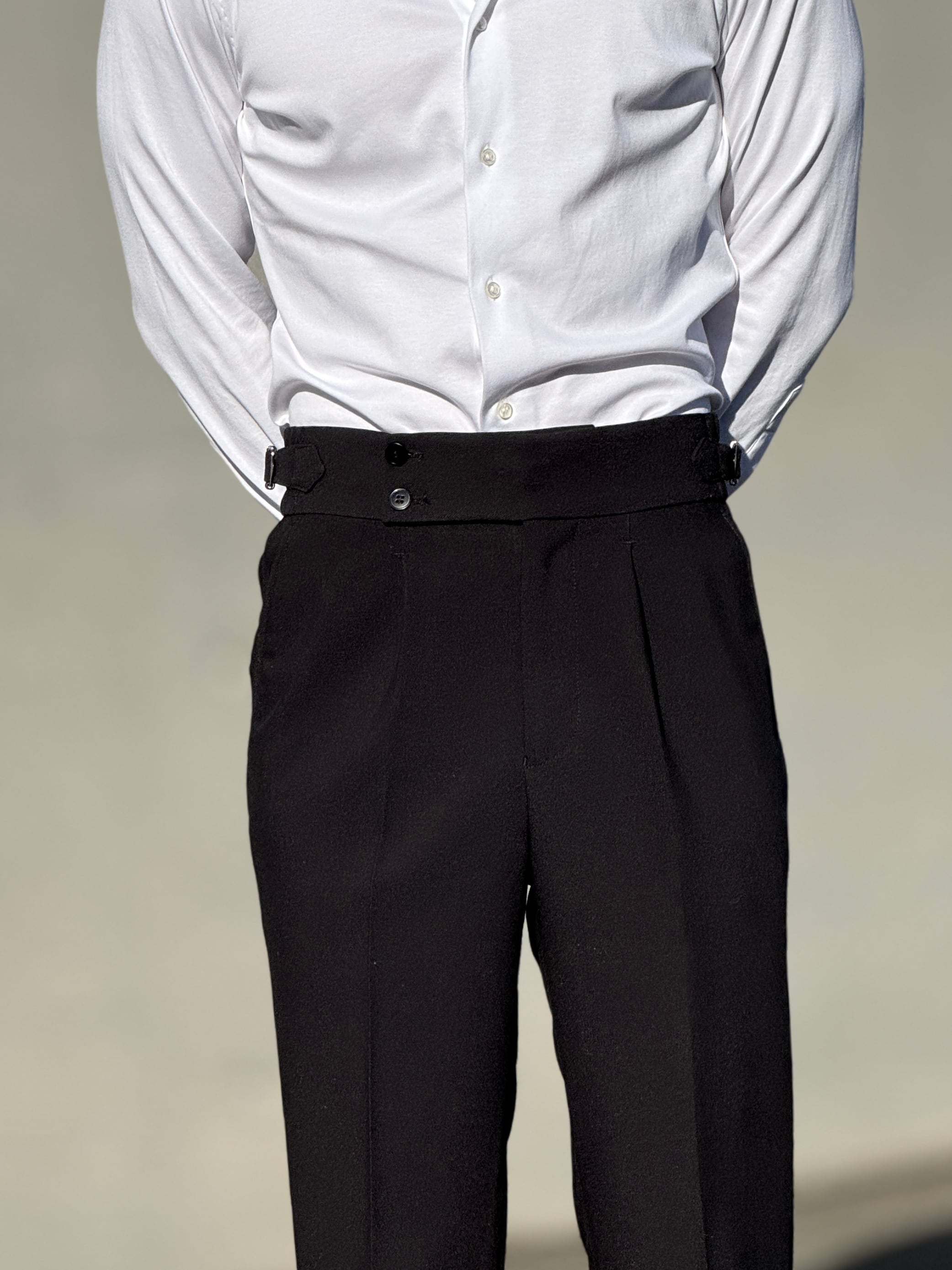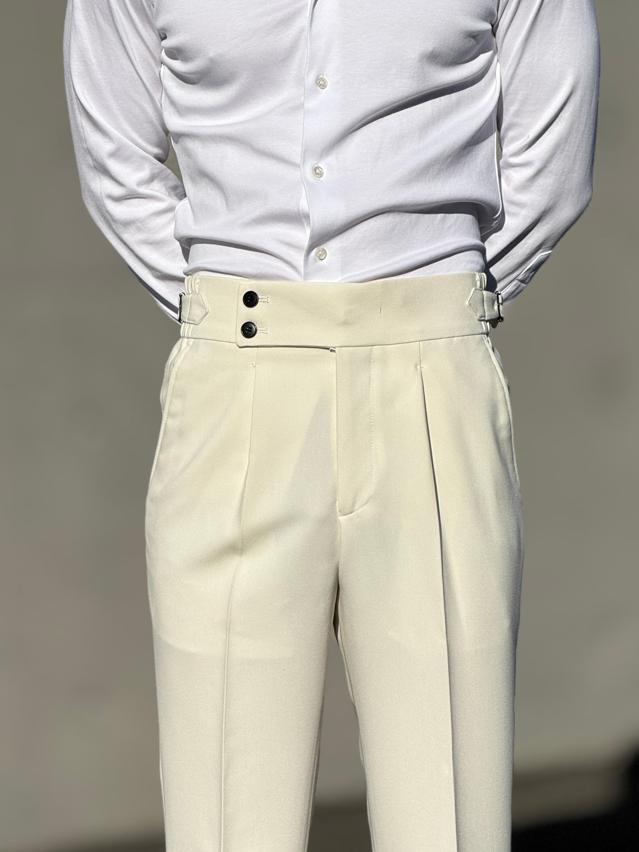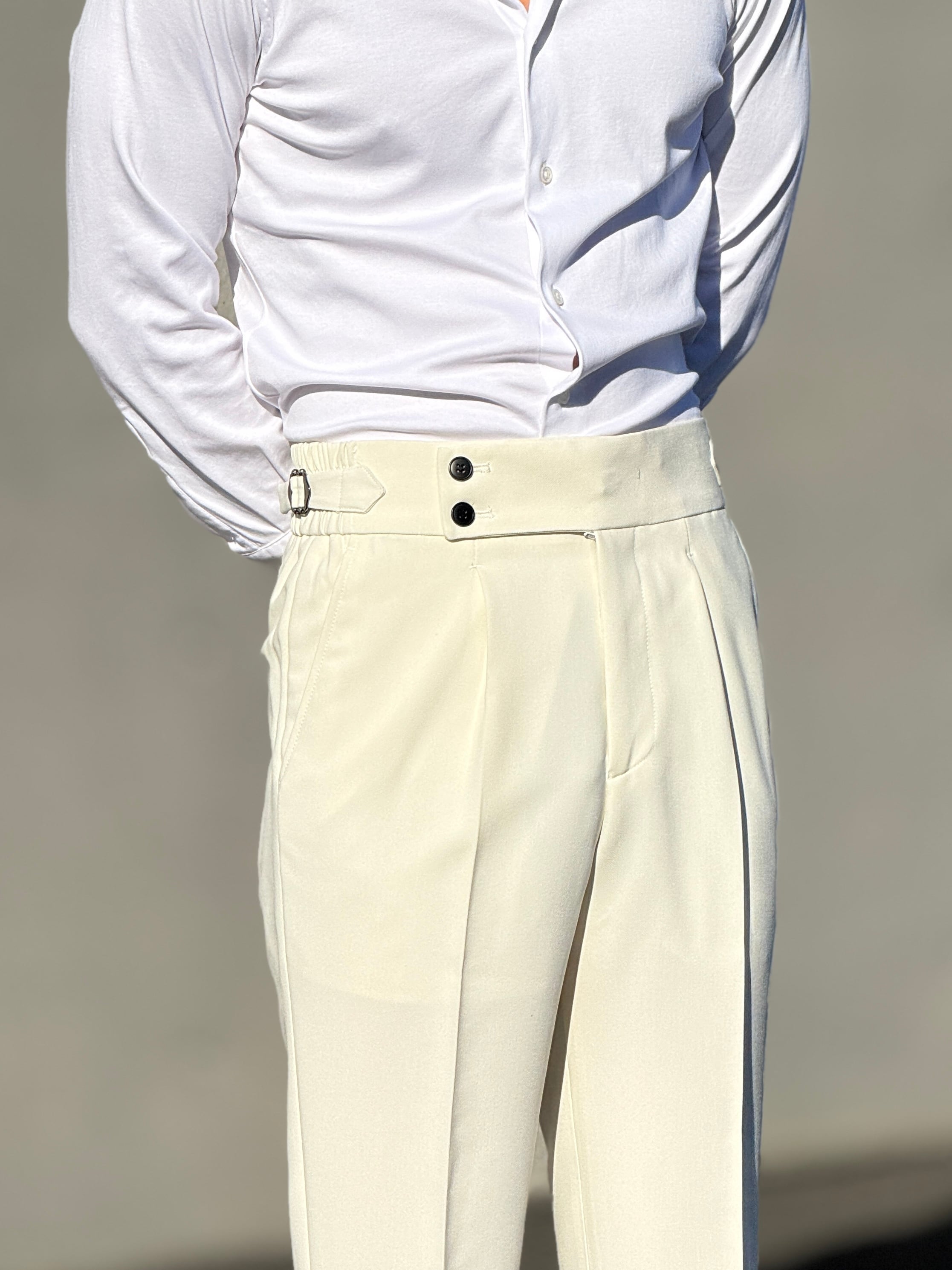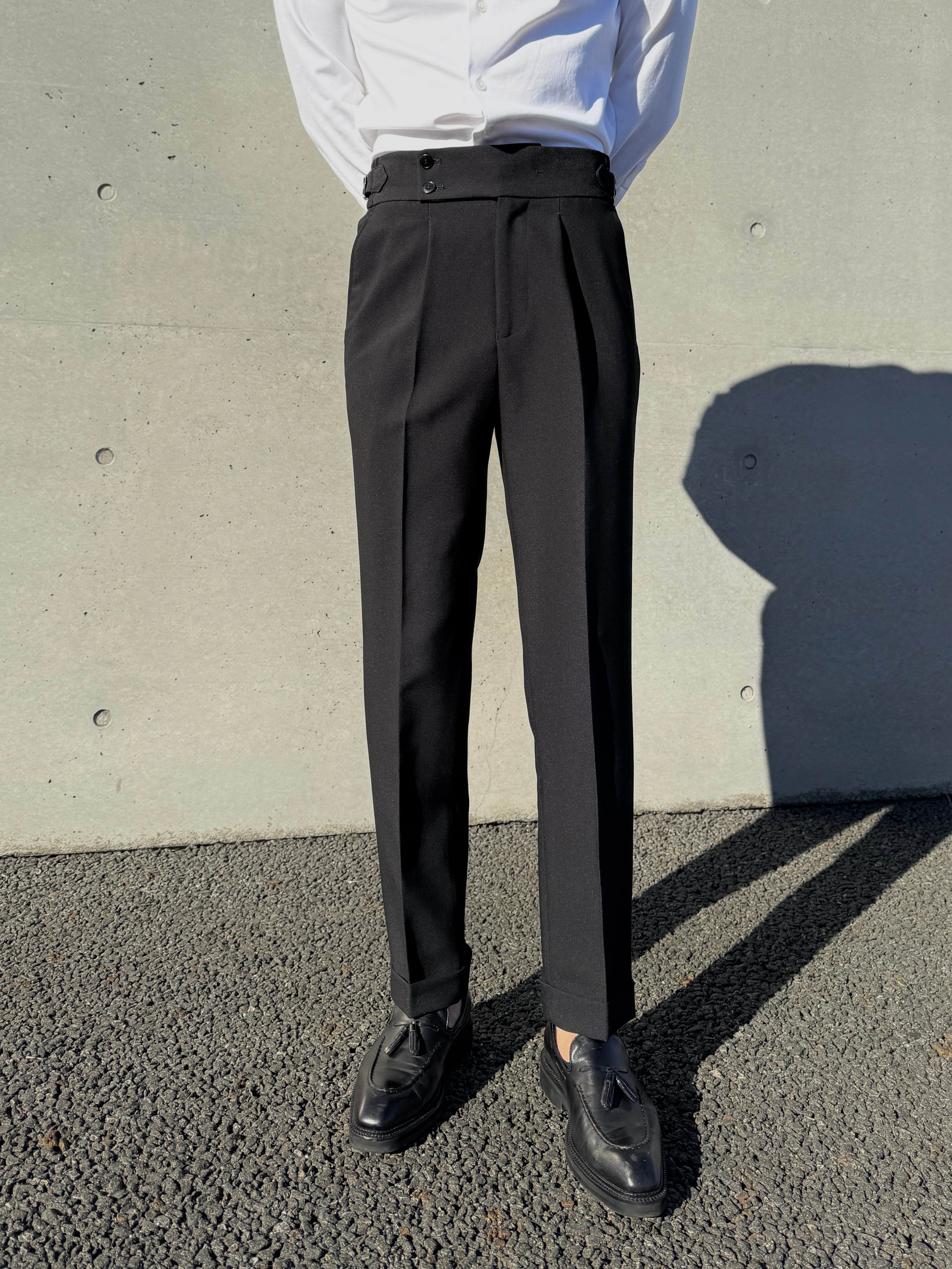 ハイウエストのデザインで、脚長効果が抜群なこのスラックスは、スタイリッシュさを実現します。